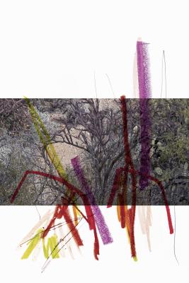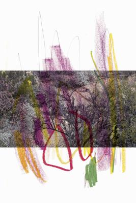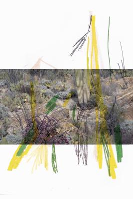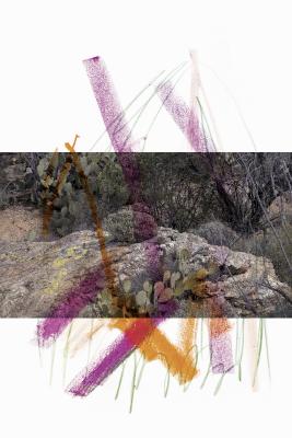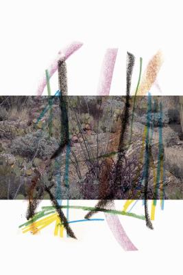 In her contribution for zweikommasieben, Atkinson offers a series of five collages entitled Ambient Park, 2017_2019, which can be understood as an extension of the sold-out print run of Ambient Park [Shelter Press, 2017]. Atkinson extends the source material through minimal intrusions—the former in this case being photographs of a desert landscape, the latter broad lines in wax paint. The resulting composition seems coincidental, yet calmly poetic at the same time.
