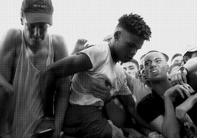 Even though being a fan can be practiced (very) actively, it’s still very much a passive role. Or to put it differently: fans need artists, artists don’t necessarily need fans. In “The Audience” Rossi challenges this dialectic, and he centers the stage-storming fans as a subject worth observing, blurring the line between admiring and being admired. A moment of anarchy leads to a new configuration, in which the rapper slowly seems to be disappearing in a sea of people, becoming one of many and losing his status until order is restored. Until his fans leave the stage, it is Desiigner who’s put in the more passive position.
