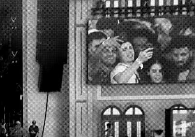 While the images of Rossi may be but one vantage point on the concert, his subjective perspective is complemented by many other documentarians immersed in the event and visible in the pictures. The fans storming the stage are suddenly in a situation that allows them to take pictures and videos that are distinct from and unique compared to what the official cameras are able to document. A selfie with the rapper, a wide angle shot of the crowd that’s still down below, a surprising new perspective: a co-presence of artist and audience with all of the concert becoming the stage and different realities overlapping. The result is a temporarily shared space in which it is not always clear who is playing which role.