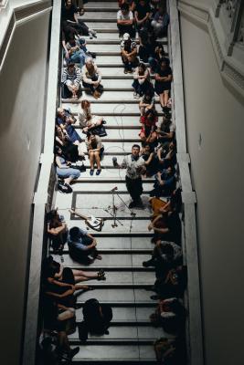 As my background is not in performance, I have a lot to learn about how to navigate a live audience. I think dramaturgically about sound composition, considering the dynamics, volume, silence, frequency range, and spatiality of my music. I don’t know if I can say the same yet in terms of choreography or my physicality. So far, the music guides my movement in space, and I feed off the energy of the audience quite a bit. I work with a series of different elements that I approach in a modular way, piecing them together differently each time, depending on the venue and the context. I use different musical instruments and combine them with ways to use architecture itself as an instrument. For example, I use a parabolic microphone to amplify the resonant feedback frequencies of each space I am performing in. Or, I attach contact microphones to windows and other surfaces to play them like instruments. I also incorporate my singing voice. And then there are pre-recorded elements to structure the timing of some of these live elements or to add layers to them.